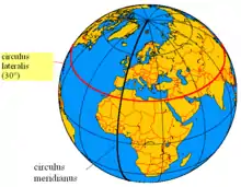The historic prime meridian or Greenwich meridian is a geographical reference line that passes through the Royal Observatory, Greenwich, in London, England.[1] The modern IERS Reference Meridian widely used today is based on the Greenwich meridian, but differs slightly from it.[2] This prime meridian (at the time, one of many) was first established by Sir George Airy in 1851, and by 1884, over two-thirds of all ships and tonnage used it as the reference meridian on their charts and maps. In October of that year, at the behest of US President Chester A. Arthur, 41 delegates from 25 nations met in Washington, D.C., United States, for the International Meridian Conference. This conference selected the meridian passing through Greenwich as the world standard prime meridian due to its popularity.[lower-alpha 1] However, France abstained from the vote, and French maps continued to use the Paris meridian for several decades. In the 18th century, London lexicographer Malachy Postlethwayt published his African maps showing the "Meridian of London" intersecting the Equator a few degrees west of the later meridian and Accra, Ghana.[4]