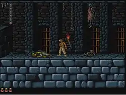 The player has a health indicator that consists of a series of small red triangles. The player starts with three. Each time the protagonist is damaged (cut by sword, fallen from two floors of heights or hit by a falling rock), the player loses one of these indicators. There are small jars containing potions of several colours and sizes. The red potions scattered throughout the game restore one health indicator. The blue potions are poisonous, and they take one life indicator as damage. There are also large jars of red potion that increase the maximum number of health indicators by one, and large jars of green potion that grants a temporarily ability to hover. If the player's health is reduced to zero, the protagonist dies. Subsequently, the game is restarted from the beginning of the stage in which the protagonist died but the timer will not reset to that point, effectively constituting a time penalty. There is no counter for the number of lives, but if time runs out, the princess will be gone and the game will be over, subject to variations per console versions: