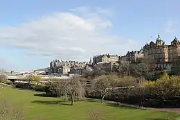 ![]() East Princes Street Gardens in 2005, looking north-east from The Mound, showing the Scott Monument (l), Balmoral Hotel (c) and Waverley Station (r) with the North Bridge behind it | |