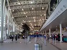 On 6 September 2017, the airport suffered significant damage when Hurricane Irma struck the island as a Category 5 hurricane. Video from a Dutch military helicopter showed the roof had been blown off the terminal, the jetways were damaged, and there was a significant amount of sand (blown through the fences from Simpson Bay Beach) and flooding on the runway.[10] The airport reopened on 10 October 2017 using temporary facilities while repair work commenced.[11] Pavilions were in use during reconstruction of the main terminal. It was hoped to move the airport's departure and arrival operations into the ground floor of the main terminal building by November. In December 2018, temporary arrival and departure facilities opened within the first level of the terminal building.[12] The entire upper floor of the terminal and the four jet-bridges remain temporarily out of commission.