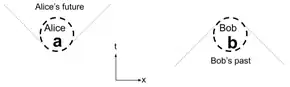 A spacetime diagram has a time coordinate going vertical and a space coordinate going horizontal. Alice, in a local region on the left, can affect events only in a cone extending in the future as shown; the finite speed of light prevent her from affecting other areas including Bob's location in this case. Similarly we can use the diagram to reason that Bob's local circumstances cannot be altered by Alice at the same time: all events that cause an effect on Bob are in the cone below his location on the diagram. Dashed lines around Alice show her valid future locations; dashed lines around Bob show events that could have caused his present circumstance. When Alice measures quantum states in her location she gets the results labeled ; similarly Bob gets . Models of locality attempt to explain the statistical relationship between these measured values.