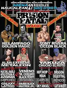 Prisión Fatal (2014) was a professional wrestling major event, produced by the Mexico based International Wrestling Revolution Group (IWRG) professional wrestling promotion. The event took on August 27, 2014, at "Arena Naucalpan" in Naucalpan, State of Mexico, IWRG's main venue and was the fourth show promoted under that name. The main event was the eponymous Prisión Fatal (Spanish for "Deadly Prison") Steel cage match where the last person remaining in the cage was forced to unmasked or shaved bald as per the match stipulation. The Prisión Fatal match included Alan Extreme, Chucho el Roto, Ciclon Black, Golden Magic, Metaleón, Relámpago, Tony Rivera and Yakuza. Ciclon Black, Golden Magic, Metaleón, Relámpago and Yakuza all put their mask on the line while Alan Extreme, Chucho el Roto and Tony Rivera risked their hair on the outcome of the match. In the end Ciclon Black was the seventh and last man to climb out of the cage, leaving Alan Extreme behind. After the match Alan Extreme had all his hair shaved off while in the ring as the lucha libre traditions dictate. The show also featured Los Gringos VIP (Apolo Estrada, Jr., Avisman and El Hijo del Diablo) defend the Distrito Federal Trios Championship against Black Terry, Dr. Cerebro and Veneno. The Distrito Federal championship is IWRG's secondary trios title and is only allowed to be defended in the Distrito Federal of Mexico City. Also on the show the AIWA Argentinean National Cruiserweight Champion Hip Hop Man defended the championship against Mexican challenger Dragón Celestial as Hip Hop Man was visiting Mexico from Argentina. The show featured two additional matches.