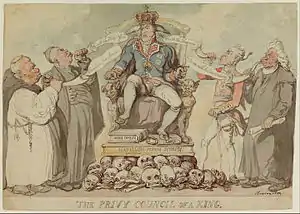 Caricature by Thomas Rowlandson titled Privy Council of a King (1815); throned is George IV, then Prince Regent.