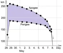 On 29 April, Roscosmos officially announced that the spacecraft was out of control and its orbit would eventually decay to fall back into Earth's atmosphere, with multiple systems suffering from failure and the main engine's fuel lines depressurized.[9][12][13] The spacecraft was expected to disintegrate in the Earth's atmosphere between 7 and 11 May 2015.[14] On the same day, the United States' NORAD reported that 44 pieces of debris "in the vicinity of the resupply vehicle and its upper stage rocket body" were being tracked by space tracking systems.[15] Currently, various Russian sources reported that the potential cause of the anomaly may be related to the upper stage rocket engine shutdown or with the separation of the Progress spacecraft from the upper stage.[9][15] A representative of the United States Air Force claimed that debris in the area indicated a blast.