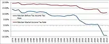 As of 2010, there were 118.7 million taxpaying households in the United States.[6] The median marginal federal income tax rate is 15%.[7] In addition, there are numerous other federal taxes and transfers that affect one's net tax burden, including federal payroll taxes (both employer share and employees share), Corporate Income Taxes, Excises Taxes, Estate and Gift Taxes, Customs Duties and Miscellaneous Receipts. According to the Congressional Budget Office (CBO), the median taxpayer in the United States has had an effective overall federal tax burden that has declined from 19.14% of Before-Tax Income in 1979 to 11.20% of Before-Tax Income as of 2010. When simply comparing Market Income to After Tax Income, due to Government Transfers the Net Federal Tax burden of the median taxpayer has declined from 13.94% in 1979 to -8.76% in 2010 - this metric became negative for the first time in 2008.