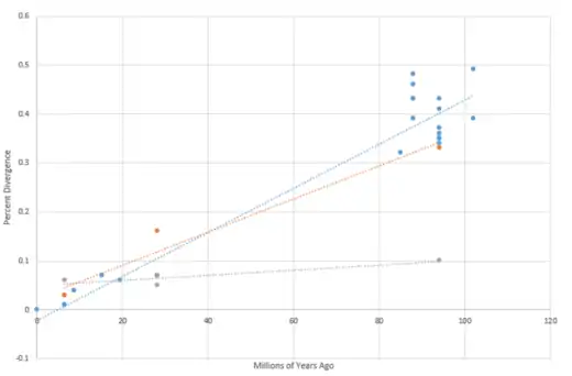 Comparison of evolutionary histories between Cytochrome C (grey), Fibrinogen (orange), and PRR30 (blue).[29]