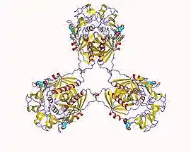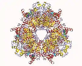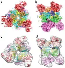 - 1 2 3 Huang CS, Sadre-Bazzaz K, Shen Y, Deng B, Zhou ZH, Tong L (August 2010). "Crystal structure of the alpha(6)beta(6) holoenzyme of propionyl-coenzyme A carboxylase". Nature. 466 (7309): 1001–1005. doi:10.1038/nature09302. PMC 2925307. PMID 20725044.