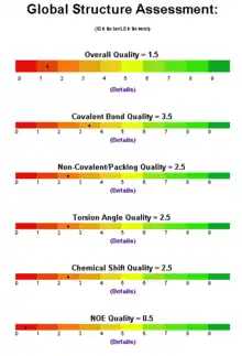 Most NMR-based structure validation protocols primarily use NOE (Nuclear Overhauser Enhancement), J-coupling or residual dipolar coupling (RDC ) data to assess or validate structures. In particular, they try to assess the agreement between the experimentally observed and the calculated NOEs, RDCs and/or J-couplings. Good agreement between the calculated and observed parameters normally indicates a good structure. Other methods for structure validation (such as ProCheck, MolProbity, ResProx and VADAR) focus on measuring coordinate data, rather than experimental data, to assess the quality of the bond or torsion angle geometry. PROSESS is unique among structure validation servers in that it evaluates both coordinate quality and experimental data quality.