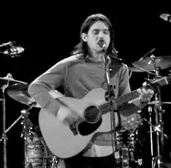 Phil Ochs, one of the leading protest singers of the decade (or, as he preferred, a "topical singer"), performed at many political events, including anti-Vietnam War and civil rights rallies, student events, and organized labor events over the course of his career, in addition to many concert appearances at such venues as New York City's The Town Hall and Carnegie Hall. Politically, Ochs described himself as a "left social democrat" who turned into an "early revolutionary" after the 1968 Democratic National Convention in Chicago, which had a profound effect on his state of mind.[41] Some of his best known protest songs include "Power and the Glory", "Draft Dodger Rag", "There but for Fortune", "Changes", "Crucifixion", "When I'm Gone", "Love Me, I'm a Liberal", "Links on the Chain", "Ringing of Revolution", and "I Ain't Marching Anymore". Other notable voices of protest from the period included Joan Baez, Buffy Sainte-Marie (whose anti-war song "Universal Soldier" was later made famous by Donovan),[42] and Tom Paxton ("Lyndon Johnson Told the Nation" – about the escalation of the war in Vietnam, "Jimmy Newman" – the story of a dying soldier, and "My Son John" – about a soldier who returns from war unable to describe what he's been through), among others. The first protest song to reach number one in the United States was P.F. Sloan's "Eve Of Destruction", performed by Barry McGuire in 1965.[43][44]