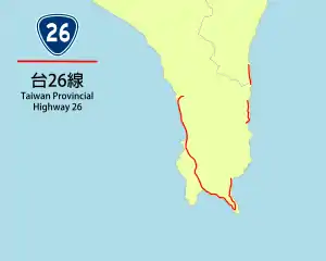 Provincial Highway 26 is a Taiwanese highway that starts from Fangshan, Pingtung County and ends in Daren, Taitung County. The highway is also known as Ping-E Highway (屏鵝公路) for the stretch between Fangshan and Cape Eluanbi in Kenting National Park, and Jia-E Highway (佳鵝公路) between Cape Eluanbi and Jialeshui (佳樂水). It is the primary highway to Kenting National Park and the beaches in Kenting. The route length is 93.5 kilometres (58.1 mi).[1]