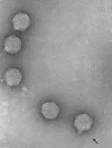 Electron micrograph of bacteriophage gh-1 negatively stained with uranyl acetate. Magnification X 300,000. Two fibers attached to the wedge-shaped tail are visible on the bacteriophage, as indicated by an arrow.