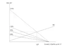 The Pareto optimal provision of a public good in a society occurs when the sum of the marginal valuations of the public good (taken across all individuals) is equal to the marginal cost of providing that public good. These marginal valuations are, formally, marginal rates of substitution relative to some reference private good, and the marginal cost is a marginal rate of transformation that describes how much of that private good it costs to produce an incremental unit of the public good. This contrasts to the Pareto optimality condition of private goods, which equates each consumer's valuation of the private good to its marginal cost of production.[9][39]