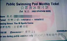 The Public Swimming Pool Monthly Ticket Scheme (Chinese: 香港公眾游泳池月票計劃) began on 5 July 2012 (ticket selling started on 21 June).[25] The Leisure and Cultural Services Department is responsible for this scheme.[26]