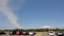 Parking lot and Popocatepetl volcano and Iztaccihuatl mountain in the background