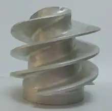 An inducer is the axial inlet portion of a centrifugal pump rotor, the function of which is to raise the inlet head by an amount sufficient to prevent significant cavitation in the following pump stage.[1] It is used in applications in which the inlet pressure of a pump is close to the vapor pressure of the pumped liquid. Inducers are frequently included in design of turbopumps for liquid propellant rocket engines, although they are used in other applications which require high suction performance.[2] It does not increase NPSHa but decreases NPSHr for Pump.