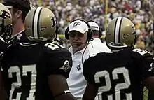 In December 1976, Purdue hired 41-year-old Jim Young away from Arizona.[37] When Young arrived at Purdue, he named true freshman, Mark Herrmann as the team's starting quarterback, and the freshman lived up to expectations, throwing for 2,041 yards through the team's first eight games.[38] Herrmann would break the NCAA record for passing yards (2,453) and passing touchdowns (18) for freshman.[39] In 1978, Young would lead Purdue to a 9–2–1 record, and a victory over Georgia Tech in the 1978 Peach Bowl. Young was named the Big Ten's Coach of the Year, the first Boilermaker head coach to ever win the award.[40] Throughout his career, Herrmann would break the Big Ten's all-time career passing yards (6,734) and passing touchdowns (48) before his senior season.[41] After a disappointing 1981 season, Young resigned from his position as head coach at Purdue, citing his desire to concentrate on athletic administration.[42]