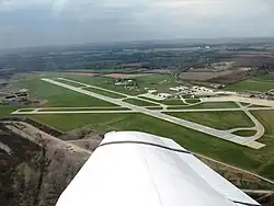 The airport covers an area of 527 acres (213 ha) at an elevation of 606 feet (185 m) above mean sea level. It has two asphalt paved runways: 10/28 is 6,600 by 150 feet (2,012 x 46 m) and 5/23 is 4,225 by 100 feet (1,288 x 30 m).[1]