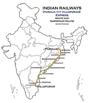 The Purulia–Viluppuram Superfast Express is an Superfast Express train belonging to Southern Railway zone that runs between Purulia Junction and Viluppuram Junction in India. It is currently being operating with 22605/22606 train numbers on a weekly basis.[1][2][3] Extended upto Tirunelveli Junction soon by southern railway press release
