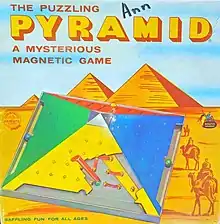 Puzzling Pyramid (1960) is a game for 2, 3 or 4 players of all ages. The object of the game is for each player to use a magnetic exploring wand to guide a steel ball up one of the four colored (yellow, red, green, blue) sides of a pyramid into a common treasure vault at the top. On the inside of each side of the pyramid, plastic tunnel blocks are placed by an opposing player before the start of the game, which are designed to impede the wand user's progress to the top, however at least one open path must be provided.[18][19]