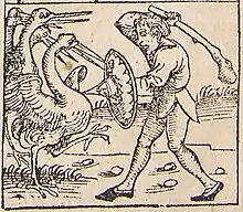 Boeus says also, of the crane, that she had been a woman eminent among the Pygmies, named Gerana. She, honoured as a god by her citizens, held the true gods in low esteem herself, especially Hera and Artemis. Hera, therefore, became angry, metamorphosed her into a bird of ugly shape, and made her an enemy and hateful to the Pygmies who had honored her; Boeus also says that from her and Nicodanas was born the land tortoise.[13]