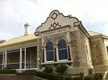 It is built of granite and has nine bedrooms and outbuildings.[1] The projecting wings have distinctive curvilinear parapeted gable and bay windows. The roof is made from hipped corrugated iron and topped with rendered brick decorative chimneys. Enclosed in a verandah the building is set on 3,400 square metres (0.840 acres) of low manicured gardens. Pyrmont is based on the South African Cape Dutch Colonial architectural design.[2]