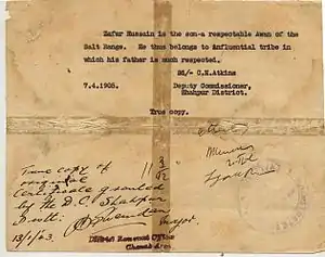 Khan Sahib, Qazi Zafar Hussain came from a qadi's family which had, since the 16th century, been prominent among the landed aristocracy of the Soon Valley. He belonged to Awans[1] tribe of ancient repute. He was awarded the title of Khan Sahib by the British Crown. This was a formal title, a compound of khan (leader) and sahib (Lord), which was conferred in Mughal Empire and British India. Although his father, Qazi Mian Muhammad Amjad forbade his descendants to establish Dargah, he was considered Sajjada Nashin by the people of his area. "Sajjada nashins" David Gilmartin asserts, "claimed to be the descendants of the Sufi,[2] 'saints', intermediaries between the Faithful and their God, and this cut against the grain of Islamic orthodoxy ... in kind, of their special religious status, these sajjada nashins had become men of local standing in their own right."[3] However he never claimed to be a Sajjada Nashin. In the Punjab, the sajjada nashin or pir families were not so rich in terms of land as the great land lords of Punjab but these sajjada nashin or pir families exerted great political and religious influence over the people.[4] The British could not administer the area without their help and no political party could win the election without their help.