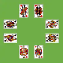 Meanwhile, in 1892, Professor Hoffmann described a different game called Quadrille in which the cards were built up in ascending sequence on Sixes and descending sequence on Fives, all laid out in a star shape.[3] The Queens were removed from the pack at the outset and placed decoratively within the star. This version subsequently acquired the name Captive Queens.[lower-alpha 1] In this game the name describes the way the Queens are enclosed within the star formed by the foundations. Alluding to the name, Quadrille, but describing the rules for the later game, Parlett calls it as "a pleasant little pictorial which may be said to represent the dance of the cardboard court."[4] The wagon-wheel tableau looks like a quadrille dance from 18th-19th century Europe.[5][lower-alpha 2]
