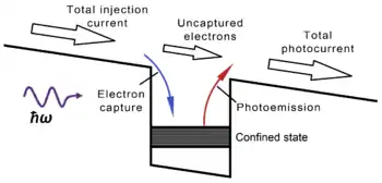 The photoconductive gain is the probability that an excited electron contributes to the photocurrent—or more generally, the number of electrons in the external circuit, divided by the number of quantum well electrons that absorb a photon. Although it might be counterintuitive at first, it is possible for to be larger than one. Whenever an electron is excited and extracted as photocurrent, an extra electron is injected from the opposite (emitter) contact to balance the loss of electrons from the quantum well. In general the capture probability , so an injected electron might sometimes pass over the quantum well and into the opposite contact. In that case, yet another electron is injected from the emitter contact to balance the charge, and again heads towards the well where it might or might not get captured, and so on, until eventually an electron is captured in the well. In this way, can become larger than one.
