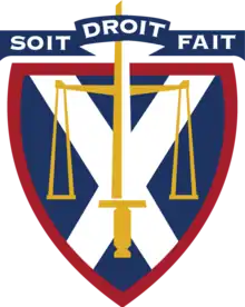 The Faculty of Law of Queen’s University at Kingston's Arms were registered with the Canadian Heraldic Authority on April 20, 2007.[3] The crest of Queen's University's Faculty of Law consists of a sword and the scales of justice superimposed on the Cross of St. Andrew. Professor Stuart Ryan, one of the law school's founding faculty members, gave the school its motto – Soit Droit Fait. The phrase has a double meaning. It is a statement of the power and creative potential inherent in the law that was used by medieval kings when assenting to bills passed by Parliament – "let the law be made." It is also an expression of the commitment to justice and decency implicit in the ideal of legality – "let right be done."