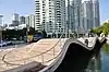 Queens Quay continues to go through a significant transformation. Originally, it served as an access road for the various ports and slips in the inner harbour. The street between Yonge Street and Parliament Street was home to storage buildings devoted to trade on the Saint Lawrence Seaway, major industries such as the Redpath Sugar Refinery and Victory Mills, as well as small commercial enterprises.[2] However, the mainly industrial uses along Queens Quay were slowly replaced by commercial and residential uses, mainly high-rise condominiums. Between 1975 and 1979, a cluster of large, concrete towers were erected at the foot of Bay Street, south of Queens Quay; these included the Westin Harbour Castle and Harbour Square. In 1990, the 40-storey York Quay towers were built and remain the tallest buildings on Queens Quay.[3] The scale and density of these and subsequent high-rise development along Queens Quay were criticized for blocking the lake and failing to provide a welcoming realm for visitors. In 1997 City School (Toronto) relocated to 635 Queens Quay West.[4] In 1999, the Toronto Transit Commission opened a dedicated streetcar right-of-way in the median from Bay Street to Bathurst Street.