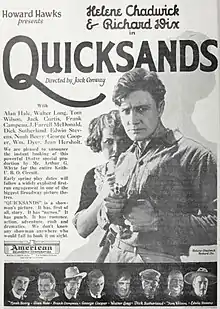 Quicksands is a 1923 American silent crime drama film directed by Jack Conway, written by Howard Hawks, and starring Helene Chadwick and Richard Dix. The supporting cast features Alan Hale Sr., Noah Beery Sr. and Jean Hersholt. The film was released on February 28, 1923, by American Releasing Corporation.[1][2]
