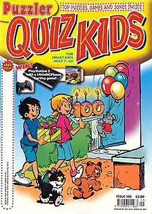 Quiz Kids (sometimes Puzzler Quiz Kids) is a defunct children's puzzle magazine owned by Puzzler Media. Publishing from 1987 to 2023, it is the longest-running magazine of its genre.[1][2] Based in the Bromley, UK, each issue consisted of 100 challenges including crosswords, dot-to-dots, spot the differences, word searches, jokes and various other tasks created for children aged 7–12.[1] The magazine also came with a free pen or a pencil attached to the front cover.[3] The puzzles were created specially for the magazine, in line with the guidelines of the UK's National Curriculum.[4] As of 2015 Quiz Kids is published every 2nd Month.[2] It was also published in New Zealand.[4]