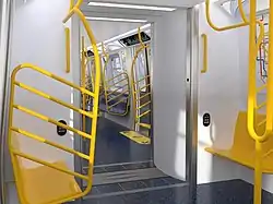 The design of the R262 subway cars is based on the specifications of the R211 cars, which are being built for the B Division. They will have modern signage and communication, an Ethernet network, and updated crash energy management standards. The R262s may adopt open-gangways, allowing passengers to move between cars during train movement.[1] They will be equipped with communications-based train control (CBTC). Unlike the R211s, R262s will have additional audio induction loops for riders with hearing impairments.[1]