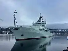 She has a cruising speed of 12 knots and a maximum speed of 15 knots.[9] She has six diesel generators, three 1,500 kW and three 750 kW, which provide electrical and propulsion power to the ship. The generators, in turn, power two 3,000 hp DC electric motors which provide the ship's main propulsion. The DC motors power two 360-degree azimuth z-drives with four-bladed fixed-pitch propellers. The ship also has a 360-degree azimuth Tees White Gill water jet bow thruster driven by a separate 1,100 hp DC motor.[10] Controls are installed to integrate the z-drives and bow thruster into a dynamic positioning system. Engineers can select fuel-efficient combinations of generators to power the ship whether she is towing an instrument at 1 knot, transiting at 15 knots, or anywhere in between.[11] Her fuel tanks can hold up to 280,000 US gallons (1,100,000 L) giving her an unrefueled range of 12,000 miles at 15 knots.[12][9]