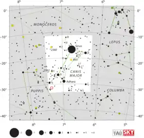 RX J0720.4−3125 is a neutron star in the constellation Canis Major. It was discovered in 1997 in the ROSAT All-sky survey.[1] Measurement of its parallax leads to an estimate of around 360 parsecs (1,200 light-years) for its distance from Earth.[2] It is a member of the Magnificent Seven, a group of neutron stars that are relatively near to the Solar System. RX J0720.4–3125 has a radius of around 5 km. Its spectrum and temperature appear to be mysteriously changing over several years. The nature of the changes are unclear, but it is possible there was an event such as the star's absorption of an accretion disc.[3]