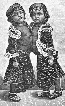 The girls were removed from the sadhus' care by an English promoter called Captain Coleman, and they sailed for Europe with him in 1892.[4] Their first public exhibition outside of India was at the Royal Aquarium in London. In 1893 they traveled to the United States, where they were displayed at the World's Columbian Exposition in Chicago that year. Also in 1893, the British Medical Journal published a report about their physical state, finding them "free from all element of repulsiveness" and "apparently perfect in every respect, except that from the ensiform cartilage to the umbilicus they are united together."[5] Another medical journal reported that "the children seldom quarrel".[6] After their Chicago appearance, the Orissa Twins toured extensively with the Barnum and Bailey Circus sideshow.[1] They were said to speak English, French, and German, and to have a Scottish governess.[7]
