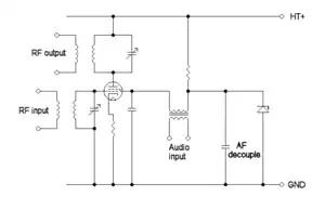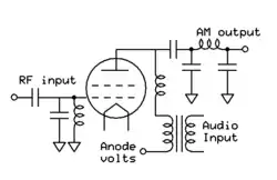 A wide range of different circuits have been used for AM. While it is perfectly possible to create good designs using solid-state electronics, valved (tube) circuits are shown here. In general, valves are able to easily yield RF powers far in excess of what can be achieved using solid state. Most high-power broadcast stations below 3 MHz use solid state circuits, but higher power stations above 3 MHz still use valves.