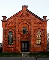 In 1857, there were 571 Jews out of the total population of 1,040 people.[13] By 1865, Jews accounted for 45 percent of the town's inhabitants. In the second half of the 19th century the Kehilla built a brick synagogue designed by S. Kmita with Moorish-style motifs, in place of the original wooden one. The Jewish community (population 532 by 1900)[14] was completely destroyed in the Holocaust, with about 200 of its members deported in January 1942 to the ghetto in Mława, and from there to Treblinka and Auschwitz death camps in November 1942.[15] Today there are no Jews in Radzanów.[16] The synagogue was entered into the national register of historic monuments in 1975 and repaired in 1986.[17]