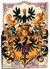 In 1518, Holy Roman Emperor Maximilian I created Mikalojus Radvila's son, Mikołaj, Reichsfürst ("Imperial Prince") of Goniądz and Meteliai after the Jagiellonian-Habsburg congress at Vienna.[3][6] Mikołaj Radziwiłł also received an expanded, more solemn coat of arms: as princes of the Holy Roman Empire, the Radziwiłłs bore a black eagle, on whose breast is a shield with Trąby and other emblems. The family motto is "God advises us"[7] (Polish: Bóg nam radzi, Belarusian: Бог нам раіць, Boh nam rajić).