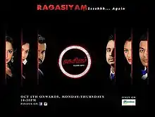 Ragasiyam 2 (Tamil: ரகசியம் 2) is a 2015 Tamil soap opera that followed its first season, Ssshhh and aired Monday to Thursday on MediaCorp Vasantham from 5 October 2015 to 24 December 2015 at 10:30PM SST for 45 episodes. The show starred Gunalan Morgan, Saravanan Ayyavoo, Soundrarajan Jeeva, Vikneswary Se, Satyamorthi, Malene and Mournha among others.[1]