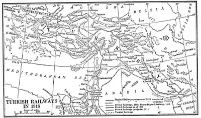 The railways in the Ottoman Empire were built thanks to foreign funding, with the exception of the Hijaz Line. The funds were first provided by the British, then by the French and Germans.[2]