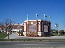 Ralph Engelstad Arena, which seats 11,643, opened on October 5, 2001 and is located on the UND campus.[2] The REA is home to the UND men's ice hockey team (UND women's ice hockey team discontinued after 2016–17 season), and hosts select games for UND men's and women's basketball. The arena also hosts many non-athletic events including concerts and a yearly circus. Called the "Taj Mahal of hockey," the $104 million arena was built with materials that would not usually be found in such a facility.[2][3] For instance, the concourses of the REA are covered in granite flooring, each spectator seat is made of Cherry wood and leather upholstery, escalators bring spectators between levels, and full-color LCD displays dot the arena.[2] The REA has been called one of the finest facilities of its kind in the world.[2][4] Former NHL hockey player Wayne Gretzky has called the structure "one of the most beautiful buildings we have in North America."[5]