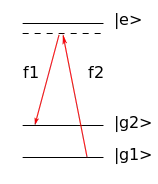The illustration of this process is shown in the example schematic illustration of a two-photon Raman process. It enables the transition between the two levels and . The intermediate, virtual level is represented by the dashed line, and is red-detuned with respect to the real excited level, . The frequency difference here matches exactly the energy difference between and .