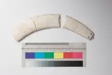 Magic wand #1795 H 12 cm, L 2.5 cm, W 2.7 cm. This piece was a part of an ivory rod. It has two recumbent lions carved on each side. The top part of the rod is lost. Magic rods consist of individual segments that are joined by dowels.[7] There are other examples from the Middle Kingdom of Egypt, where the rods are made of steatite.[8]