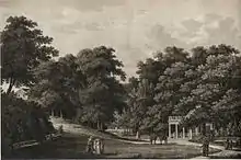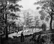 Due to the many new buildings, the capital soon ran out, which meant that the court marshal Achates von Platen's proposal to lease Ramlösa Well for 50 years was gladly accepted.[23] Together with the well doctor Eberhard Zacharias Munck af Rosenschöld, von Platen was responsible for the well's new glory days, von Platen through his investments and expansions of the facility and Munck af Rosenschöld through his contacts who built up the reputation of the mineral spa as a social haven. In 1807, for example, von Platen had the first hotel built within the grounds of the well: the "Great Hotel" – a 40-meter (130 ft) long and 15-meter (49 ft) wide two-storey timber-frame building with a large salon, two halls and four large guest rooms on the ground floor and 20 guest rooms in total. He also built new stables for a total of 44 horses and ten carriages and made improvements to the park. Five barrels of the 70 barrels of land to the west of the park owned by the well were set aside for gardens and the planting of 100 fruit trees. Despite doctor Munck af Rosenschöld's many disagreements with King Charles XIV John, as a liberal member of parliament,[24] many members of the royal family visited the park regularly. Crown Prince Oscar (later Oscar I) in particular was a frequent visitor.[25] The royal splendor attracted Scanian society, as well as much of the capital's upper class, to balls and other events. The period was depicted by the publicist Bernhard Cronholm as follows: