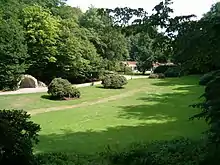 The part of the park located in the valley, usually referred to as the Ramlösa Valley, has an open character with large grassy areas interspersed with a number of smaller trees and shrubs, where rhododendrons are abundant. This part has an intimate feel as it is bordered on both sides by steep slopes with compact greenery, giving the impression of being enclosed. In the eastern part is the Water Pavilion, built in 1919–1921, just south of the original iron spring, marked by the exposed rock wall, stained red by the ferruginous water. Various concerts and events are held here from time to time, especially on Well Day. At the centre of the open grassy area, towards the valley slope, is another spring, the old alkaline spring. This is enclosed by an artificial cave, now enclosed by a fence. The valley is home to a number of unique biotopes for lichens, fungi, insects, birds and plants.