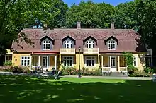 - Villa Desideria was built in 1801 for the Trolle family. It is a one-and-a-half-storey timber-frame house with brown painted oak and yellow brick in the bays. The building's long side façades have frontispieces to the north and south, while the gables have secondary porches to the east and west, added in 1899. The main entrance faces south and is located under a carved porch added between 1873 and 1879. The carpentry details are painted brown, except for the veranda balustrade and the windows and linings of the porch, which are painted white. The villa takes its name from Queen Desideria, the wife of Charles XIV John, who stayed in the villa during her stays at the spa. Previously, the house was called the Old Trolle House.[69]