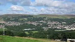 The area is characterised by its position on the south side of the West Pennine Moors. The high ground rises sharply on either side of the town with Holcombe Moor, Harcles Hill and Bull Hill to the west and Top O' Th' Hoof, Harden Moor, Scout Moor and Whittle Hill to the east.