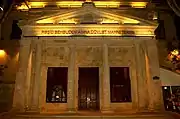 The theatre building was originally built as a synagogue in 1901.[2][3] It is in the Greek Revival style, with an Ionic order portico, and in the ornamented pediment there is a central lyre where a representation of the Tablets of Stone once featured.