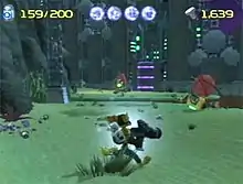 Bolts can be found in crates, along with ammo, or dropped from defeated enemies.[6] The player also needs to buy ammo for most weapons, but a small number can function without the need for ammo.[6] Vendors, which sell weapons and ammo, are situated at strategic points throughout levels.[6] After completing the game, the player may choose to enter "challenge mode", in which the game's difficulty level rises considerably, but all bolts and weapons acquired the first time are carried through. There is also the option to buy "gold weapons", more powerful versions of existing weapons. The game's health system, Nanotech,[6] starts at four health bubbles equivalent to be able to take four hits, but upgrades can be purchased, giving the player a total of five hit points with the first upgrade and eight hit points with the second.